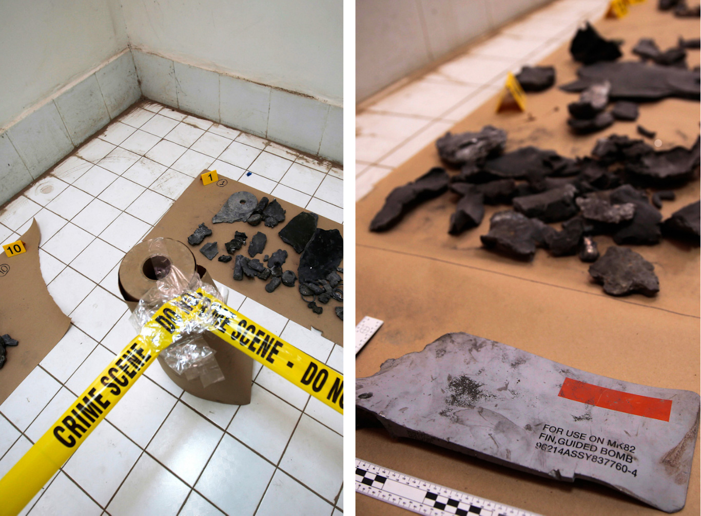 MK82 bomb fragments found in the rubble of Al Kubra are seen at a crime lab in Sanaa, Yemen, Oct. 8, 2016. Hani Mohammed | AP