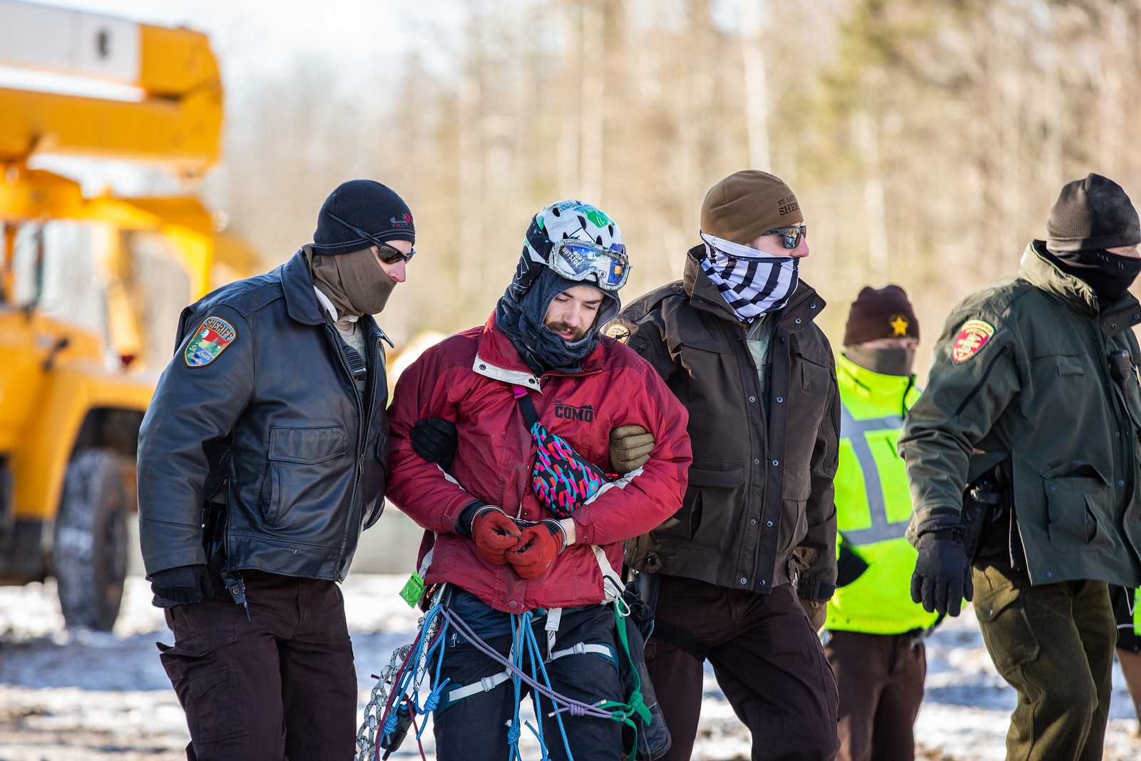 St. Louis County Sheriff’s officers escort DelMain in handcuffs he was removed from a tree he had been occupying along the Line 3 pipeline pathway on December 14. Emma Fiala | MintPress News